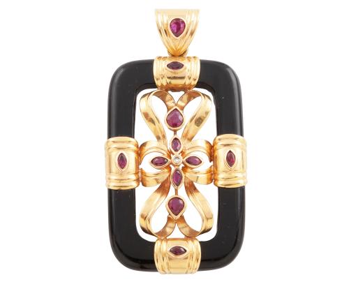 <span class='ref_item'>21 -</span> <span class="object_title">COLGANTE EN ORO 18KT, RUBÍES, BRILLANTE Y ÓNIX</span>  <p><span class="technical_description">Colgante realizado en oro de 18kt. Diseño con placa de ónix a modo de marco entrelazo con bandas de oro adornadas por rubíes centrales en talla marquise y perilla con peso aprox 1.70ct y un diamante central en talla brillante con peso aprox de 0.05ct<br/>Medidas: 6,8 x 3,4cm</span><br>Peso: <span class="PESO_HCES1">24,60</span> <span class="PESOUMED_HCES1">gr.</span><br></p>