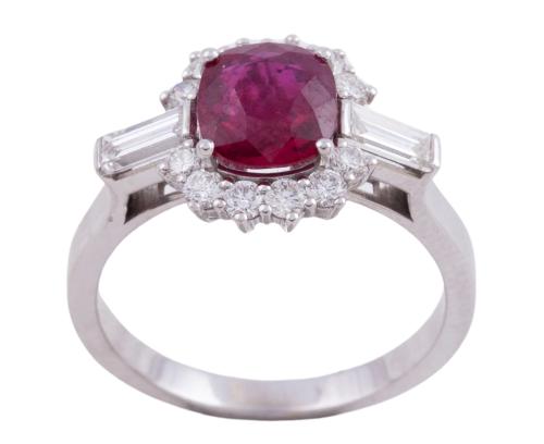 <span class='ref_item'>10 -</span> <span class="object_title">SORTIJA EN ORO DE 18KT, RUBÍ Y DIAMANTES</span>  <p><span class="technical_description">Sortija realizada en oro de 18kt con roseta central formada por rubí en talla oval con peso total aprox (1.65ct). Diamantes en talla brillante en orla con peso total aprox (0.40ct) y en hombros en talla baguette con peso total aprox (0.40ct). El peso total aprox de todos los diamantes es de (0.80ct).<br/>Medida: 12<br/> </span><br>Peso: <span class="PESO_HCES1">4</span> <span class="PESOUMED_HCES1">gr.</span><br></p>