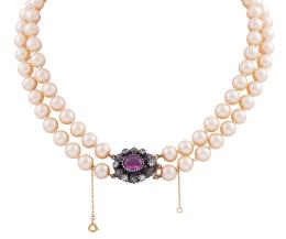 <span class='ref_item'>253 -</span> <span class="object_title">GARGANTILLA DE PERLAS CULTIVADAS</span>  <p><span class="technical_description">Gargantilla de doble hilo con perlas cultivadas calibradas aprox en 8mm. Broche realizado en metal, adornado con zafiros blancos, marcasitas y en el centro piedra de color<br/>Cierre: Caja con lengüeta y cadena de seguridad<br/>Longitud: 40cm</span><br>Peso: <span class="PESO_HCES1">89</span> <span class="PESOUMED_HCES1">gr.</span><br></p>