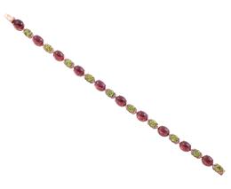 <span class='ref_item'>242 -</span> <span class="object_title">PULSERA EN PLATA DE LEY, RODOLITAS, PERIDOTOS Y DIAMANTES</span>  <p><span class="technical_description">Pulsera realizada en plata de ley rosada. Compuesta por granates rodolita en cabujón oval con peso total aprox 28ct, alternando con eslabones adornados por peridotos en talla redonda con peso total aprox 6ct y diamantes en talla brillante con peso total aprox 0.50ct. <br/>Cierre: Caja con lengüeta<br/>Longitud: 20cm<br/>Ref 14767</span><br>Peso: <span class="PESO_HCES1">17,20</span> <span class="PESOUMED_HCES1">gr.</span><br></p>