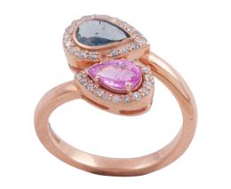 <span class='ref_item'>235 -</span> <span class="object_title">SORTIJA EN PLATA DE LEY, ZAFIROS Y DIAMANTES</span>  <p><span class="technical_description">Sortija realizada en plata de ley rosada. Diseño "Tú y yo" con zafiros, uno rosa y otro azul, en talla perilla con peso total aprox 1.50ct, orlados de diamantes en talla brillante con peso total aprox 0.20ct<br/>Medida Sortija: 15<br/>Ref 15000</span><br>Peso: <span class="PESO_HCES1">4,40</span> <span class="PESOUMED_HCES1">gr.</span><br></p>