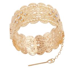 <span class='ref_item'>126 -</span> <span class="object_title">BRAZALETE ANCHO EN METAL CHAPADO EN ORO Y CIRCONITAS</span>  <p><span class="technical_description">Brazalete ancho realizado en metal chapado en oro. Bellamente decorado con trabajo de filigrana y cuatro juegos de circonitas como estrellas<br/>Cierre: Pasador con cadena<br/>Diámetro: 7cm</span><br>Peso: <span class="PESO_HCES1">45,10</span> <span class="PESOUMED_HCES1">gr.</span><br></p>