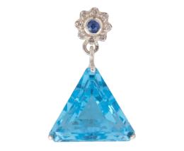 <span class='ref_item'>112 -</span> <span class="object_title">COLGANTE EN PLATA DE LEY, TOPACIO, ZAFIRO Y DIAMANTES</span>  <p><span class="technical_description">Colgante realizado en plata de ley. Topacio azul en talla trillón con peso aprox 8.80ct y en parte superior zafiro en talla redonda con peso aprox 0.05ct, orlado de diamantes en talla brillante con peso total aprox 0.10ct.<br/>Ref 15011</span><br>Peso: <span class="PESO_HCES1">3,40</span> <span class="PESOUMED_HCES1">gr.</span><br></p>