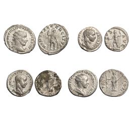 <span class='ref_item'>108 -</span> <span class="object_title">LOTE DE 2 DENARIOS DE PLATA Y 2 ANTONINIANOS DE VELLÓN DEL IMPERIO ROMANO</span>  <p><span class="technical_description">1º-Antoniniano de Gordiano III (238-239 d.C.). Moneda de vellón del Imperio romano, acuñada en Roma, con busto radiado del emperador en el anverso y personificación de la diosas Fidelidad del ejército, en el reverso. Diámetro: 19mm<br/>2º-Denario de Alejandro Severo (230 d.C). Moneda de plata del Imperio romano, acuñada en Roma, con busto laureado del emperador en el anverso y representado en el reverso como ejemplo de virtud, con atuendo militar, portando cetro y orbe. Diámetro: 18mm.<br/>3º-Antoniniano de Filipo el Árabe (244-246 d.C.). Moneda de vellón del Imperio romano, acuñada en Antioquía, con busto radiado del emperador en el anverso y personificación armada de la diosa Virtud del ejército, en el reverso. Diámetro: 23mm.<br/>4º-Denario de Alejandro Severo (227 d.C.). Moneda de plata del Imperio romano, acuñada en Roma durante el segundo consulado de Alejandro, con busto laureado del emperador en el anverso y personificación de la diosa Equidad en el reverso. Diámetro: 18mm.</span><br></p>