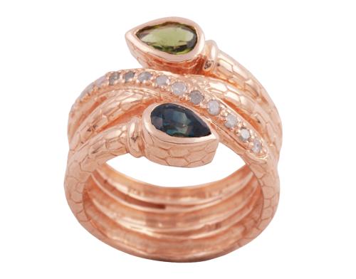 <span class='ref_item'>121 -</span> <span class="object_title">SORTIJA EN PLATA DE LEY, TURMALINAS Y DIAMANTES</span>  <p><span class="technical_description">Sortija realizada en plata de ley rosada. Diseño "Tú y yo" con cuerpo en forma de serpiente retorcida en 3 aros. Adornada en los extremos con turmalinas en talla pera, una verde y otra azul, y una banda central de diamantes en talla brillante<br/>Medida Sortija: 15<br/>Ref 15004</span><br>Peso: <span class="PESO_HCES1">7,50</span> <span class="PESOUMED_HCES1">gr.</span><br></p>