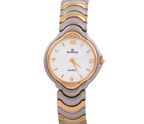 <span class='ref_item'>160 -</span> <span class="object_title">RELOJ DE SEÑORA MINISTER EN ACERO CON CHAPADO DE ORO. CUARZO</span>  <p><span class="technical_description">Reloj de señora Minister realizado en acero con partes chapadas en oro (3 micrones). Movimiento de cuarzo. Caja de 25mm. En estado de marcha</span><br>Peso: <span class="PESO_HCES1">54,40</span> <span class="PESOUMED_HCES1">gr.</span><br></p>