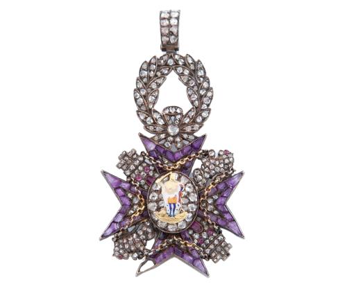 <span class='ref_item'>156 -</span> <span class="object_title">CONDECORACIÓN-COLGANTE INSIGNIA DE LA "ORDEN DEL LEÓN BLANCO"  EN ORO DE 18KT, ESMALTES, DIAMANTES Y AMATISTAS</span>  <p><span class="technical_description">Condecoración, insignia honorífica, realizada en oro de 18kt cubierta con esmaltes blancos y azules en el reverso, y, el lema real orden de la reina Mª Luisa con sus iniciales (M.L.) en el centro oval. La parte anversa está cuajada de diamantes en tallas rosa y talla antigua con peso total aprox (0.40ct) y de amatistas en tallas trapecio con peso total aprox (0.15ct). En el centro figura en esmalte que presenta desperfectos.<br/>Medidas: 5cmx3cm</span><br>Peso: <span class="PESO_HCES1">17</span> <span class="PESOUMED_HCES1">gr.</span><br></p>