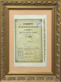<span class='ref_item'>56 -</span> <span class="object_title">OBLIGACIÓN DE PAGO PARA EL FOMENTO DEL ENSANCHE DE BARCELONA. BARCELONA, 1866</span>   <p><span class="technical_description">Obligación de pago de 200 pesos fuertes, con número 1435, firmado y fechado el 10 de marzo de 1866. Con sello de Fomento del Ensanche. <br/>Enmarcado en madera trabajada en dorado con cristal. Con calendario de pago de intereses. <br/>Medidas: 54 x 52 cm marco incluido.</span><br></p>