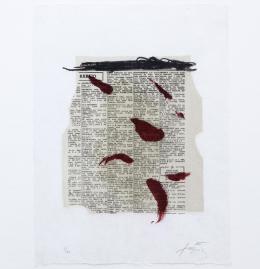 <span class='ref_item'>57 -</span> <span class="object_title">MANCHAS ROJAS SOBRE PERIÓDICO (1970)</span>   <p><span class="author">ANTONI TÀPIES (Barcelona, 1923-2012)  </span> <br><span class="technical_description">Litografía original sobre papel vitela. Obra de edición limitada con título original "Taches Rouges Au Journal", donde aparecen manchas de distinto color sobre una fragmento de periódico con varias columnas de anuncios.<br/>Firmada y numerada a lápiz manualmente por el autor en ambos ángulos inferiores. Edición 8 de 60 ejemplares.<br/>Medidas huella: 33 x 24,5 cm<br/>Enmarcado en marco negro con metacrilato.<br/>Medidas con marco: 52,5 x 42,5 cm<br/>Procedencia: Sala de subastas TGP Auction. Suiza. Lote 120. Fecha: 12/03/2023<br/> </span><br></p>