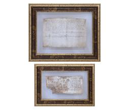 <span class='ref_item'>51 -</span> <span class="object_title">LOTE DE DOS MANUSCRITOS NOTARIALES ANTIGUOS SOBRE PERGAMINO</span>   <p><span class="technical_description">Lote compuesto de dos documentos en pergamino redactados en latín a mano, de contenido notarial que acompaña una firma o rúbrica en la parte inferior. Fechados en el reverso a finales del siglo XIV.<br/>Cada uno enmarcado en madera dorada y envejecida con cristal.<br/>Medidas hojas: 12,5 x 27cm, 18 x 27,5 cm.</span><br></p>