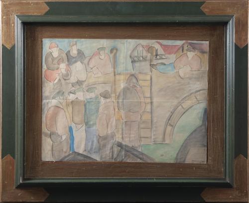 <span class='ref_item'>59 -</span> <span class="object_title">ESCENA PORTUARIA CON PERSONAJES</span>   <p><span class="author">RAFAEL BARRADAS (Montevideo, 1890-1929)</span> <br><span class="technique_material">Acuarela sobre papel</span><br><span class="technical_description">Escena con varias figuras masculinas esperando a embarcar. <br/>Firmada Barradas en el ángulo inferior derecho.<br/>Enmarcada en madera verde con detalles dorados y cristal. <br/>Medidas sin marco: 36 x 49,5cm</span><br></p>