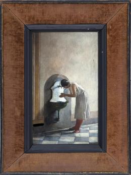 <span class='ref_item'>87 -</span> <span class="object_title">JOVEN LAVÁNDOSE LAS MANOS</span>   <p><span class="author">OSCAR REX (Praga 1857 -1929)</span> <br><span class="technique_material">Óleo sobre tabla</span><br><span class="technical_description">Muestra una joven con un vestido blanco y calcetines rojos, lavándose las manos en la fuente de una calle. Del pintor praguense Oscar Rex (década de 1890).<br/>Subastado el día 15 de marzo del 2008 en la casa de subastas alemana Auktionshaus Bergmann, con número de lote 641.<br/>Se desconoce el motivo de la eliminación total de la firma realizada a mano por el autor en el ángulo inferior izquierdo.<br/>Enmarcado en madera negra y entelada en marrón.<br/>Medidas sin marco: 38x21,5cm<br/>Medidas marco: 55x42,5cm</span><br></p>