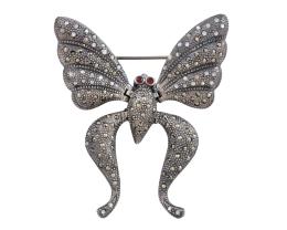 <span class='ref_item'>231 -</span> <span class="object_title">BROCHE FANTASIA EN PLATA DE LEY MACIZA, MARCASITAS Y GRANATES</span>  <p><span class="technical_description">Broche fantasía articulado en forma de mariposa realizado en plata de ley maciza con marcasitas y granates en detalle de ojos. <br/>Medidas: 6x5cm<br/>Cierre: aguja con mecanismo de seguridad</span><br>Peso: <span class="PESO_HCES1">21</span> <span class="PESOUMED_HCES1">gr.</span><br></p>