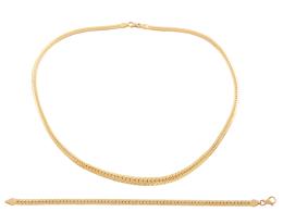 <span class='ref_item'>221 -</span> <span class="object_title">GARGANTILLA Y PULSERA EN ORO MACIZO DE 18KT</span>  <p><span class="technical_description">Conjunto de gargantilla y pulsera realizados en oro macizo de 18kt con diseño de espiguilla plana. La gargantilla más ancha en el centro<br/>Cierre: Mosquetón<br/>Longitud: 45cm la gargantilla y 17cm la pulsera</span><br>Peso: <span class="PESO_HCES1">16,10</span> <span class="PESOUMED_HCES1">gr.</span><br></p>