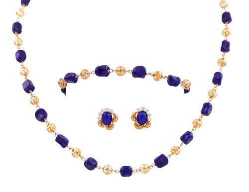 <span class='ref_item'>222 -</span> <span class="object_title">ADEREZO DE GARGANTILLA, PULSERA Y PENDIENTES EN ORO MACIZO DE 18KT Y LAPISLÁZULI</span>  <p><span class="technical_description">Aderezo de gargantilla, pulsera y pareja de pendientes realizados en oro macizo de 18kt. Con eslabón esférico y cuentas de lapislázuli. Los pendientes con cabujón de lapislázuli y circonitas<br/>Cierre: Ballestilla los pendientes, mosquetón gargantilla y pulsera<br/>Longitud: 45cm la gargantilla y 17cm la pulsera</span><br>Peso: <span class="PESO_HCES1">29,90</span> <span class="PESOUMED_HCES1">gr.</span><br></p>