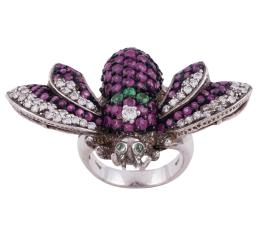 <span class='ref_item'>239 -</span> <span class="object_title">SORTIJA EN PLATA DE LEY, RUBÍES, GRANATES VERDES Y CIRCONITAS</span>  <p><span class="technical_description">Sortija realizada en plata de ley. En forma de abeja, con el cuerpo cuajado de rubíes y detalle de tres granates verdes, todos ellos en talla redonda con vistas en negro. Circonitas en alas y en detalle central con vistas en blanco. Ojos con dos cuarzos prasiolitas en talla cabujón.<br/>Medida Sortija: 13</span><br>Peso: <span class="PESO_HCES1">14,60</span> <span class="PESOUMED_HCES1">gr.</span><br></p>