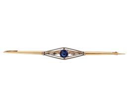 <span class='ref_item'>242 -</span> <span class="object_title">BROCHE VINTAGE EN ORO BICOLOR 14KT Y PIEDRAS DE IMITACIÓN</span>  <p><span class="technical_description">Broche de barra vintage realizado en oro bicolor de 14kt. Diseño central con forma de rombo y vistas en blanco, adornado con piedras símil de zafiro y diamantes<br/>Cierre: Aguja<br/>Longitud: 9cm</span><br>Peso: <span class="PESO_HCES1">4,50</span> <span class="PESOUMED_HCES1">gr.</span><br></p>
