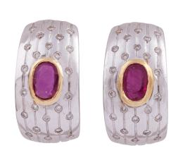 <span class='ref_item'>63 -</span> <span class="object_title">PENDIENTES EN ORO BICOLOR 18KT, RUBÍES Y DIAMANTES </span>  <p><span class="technical_description">Pareja de pendientes realizados en oro bicolor de 18kt con rubíes en talla oval engastados en bisel con un peso total aprox de 0.80ct y pequeños diamantes engastados en grano en el cuerpo de los pendientes. <br/>Cierre: Presión</span><br>Peso: <span class="PESO_HCES1">10,80</span> <span class="PESOUMED_HCES1">gr.</span><br></p>