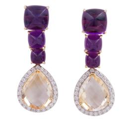<span class='ref_item'>54 -</span> <span class="object_title">PENDIENTES EN ORO 18KT, AMATISTAS, CITRINOS Y DIAMANTES</span>  <p><span class="technical_description">Pendientes largos con movimiento realizados en oro de 18kt. Con amatistas en talla fantasía con peso total aprox 18ct. En pendentif cuarzos citrinos dorados en talla perilla facetada con peso total aprox 12.50ct con orla de diamantes en talla brillante con peso total aprox 0.80ct. <br/>Cierre: Presión<br/>Longitud: 4cm</span><br>Peso: <span class="PESO_HCES1">17,30</span> <span class="PESOUMED_HCES1">gr.</span><br></p>