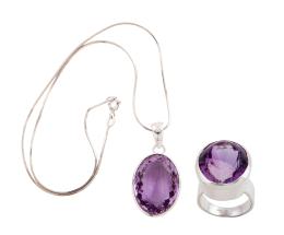 <span class='ref_item'>43 -</span> <span class="object_title">COLGANTE CON CADENA Y SORTIJA EN PLATA DE LEY Y AMATISTAS</span>  <p><span class="technical_description">Lote formado por un colgante con cadena y una sortija realizadas en plata de ley. <br/>El colgante esta compuesto por una gran amatista en talla oval con peso total aprox (11ct). La cadena es de tipo cola de ratón y cierre reasa.<br/>Longitud: 38cm<br/>La sortija está compuesta por una gran amatista en talla oval con un peso total aprox (12ct). <br/>Medida sortija: 14</span><br>Peso: <span class="PESO_HCES1">34,30</span> <span class="PESOUMED_HCES1">gr.</span><br></p>