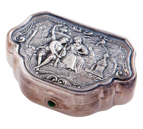 <span class='ref_item'>62 -</span> <span class="object_title">CAJA PASTILLERO EN PLATA DE LEY</span>  <p><span class="technical_description">Caja pastillero realizado en plata de ley con fina decoración repujada. En la tapa superior se representa una escena cortesana del s.XVIII con una pareja en galanteo. En su parte inferior un óvalo con motivo floral y tornapuntas. Detalle de piedra verde en el cierre. Con punzones de platero.<br/>Medidas: 5 x 3 x 1,4cm<br/>Peso total: 36,5gr</span><br></p>