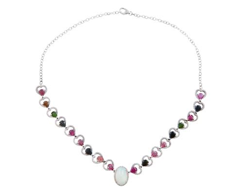 <span class='ref_item'>60 -</span> <span class="object_title">GARGANTILLA EN PLATA DE LEY, ÓPALO, TURMALINAS Y DIAMANTES</span>  <p><span class="technical_description">Gargantilla realizado en plata de ley. Con un ópalo central en talla cabujón, turmalinas de distintos colores en talla pera con un peso total aprox (13ct) y diamantes en talla brillante con un peso total aprox (1.8ct). Con cierre tipo mosquetón.<br/>Longitud: 44.5 cm<br/>ref. 16646</span><br>Peso: <span class="PESO_HCES1">18,50</span> <span class="PESOUMED_HCES1">gr.</span><br></p>
