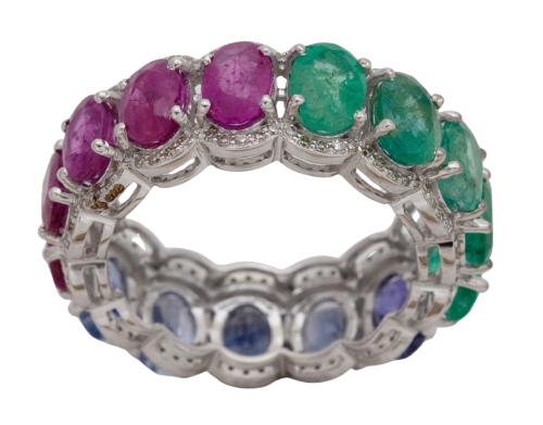 <span class='ref_item'>77 -</span> <span class="object_title">SORTIJA EN ORO BLANCO DE 9KT, ESMERALDA, ZAFIROS, RUBIES Y DIAMANTES</span>  <p><span class="technical_description">Sortija realizada en oro blanco de 9kt. Con cinco esmeraldas, cinco zafiros, cinco rubíes con un peso total aprox (9ct) y diamantes con un peso total aprox (0.9).<br/>Medida Sortija: 16<br/>Ref: 15119-1</span><br>Peso: <span class="PESO_HCES1">6,40</span> <span class="PESOUMED_HCES1">gr.</span><br></p>