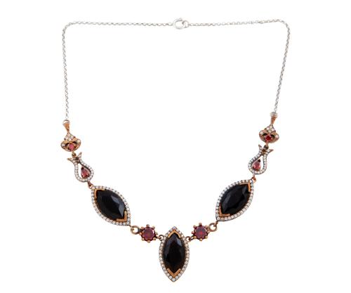 <span class='ref_item'>65 -</span> <span class="object_title">GARGANTILLA EN PLATA MACIZA DE LEY Y BRONCE CON GRANATES Y CIRCONITAS</span>  <p><span class="technical_description">Gargantilla realizada en plata maciza de ley y bronce, adornada con distintas tallas de granates rodeadas por circonitas.<br/>Longitud: 40cm y cierre: reasa</span><br>Peso: <span class="PESO_HCES1">37,70</span> <span class="PESOUMED_HCES1">gr.</span><br></p>