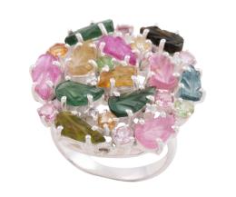 <span class='ref_item'>130 -</span> <span class="object_title">SORTIJA EN PLATA DE LEY, TURMALINAS Y BRILLANTES</span>  <p><span class="technical_description">Sortija realizada en plata de ley. Adornada por turmalinas de diferentes colores talladas como hojas y otras en talla oval, con peso total aprox 6.25ct y entre ellas pequeños diamantes en talla brillante con peso total aprox 0.10ct<br/>Medida Sortija: 17<br/>Ref 16304</span><br>Peso: <span class="PESO_HCES1">10,20</span> <span class="PESOUMED_HCES1">gr.</span><br></p>
