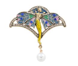 <span class='ref_item'>144 -</span> <span class="object_title">BROCHE NINFA ESTILO ART NOUVEAU EN METAL DORADO, ESMALTES, PERLA Y PIEDRAS BLANCAS Y DE COLOR</span>  <p><span class="technical_description">Broche con forma de ninfa con alas realizadas en metal dorado. Decorado con suaves esmaltes, piedras azules en las alas y en los contornos piedras blancas. Remata una perla colgante de imitación, calibrada aprox. 9,8mm.<br/>Cierre: aguja<br/>Medidas: 6x5,5cm</span><br>Peso: <span class="PESO_HCES1">15,80</span> <span class="PESOUMED_HCES1">gr.</span><br></p>