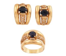 <span class='ref_item'>137 -</span> <span class="object_title">PENDIENTES Y SORTIJA EN ORO MACIZO DE 18KT, ZAFIROS Y CIRCONITAS</span>  <p><span class="technical_description">Lote formado por pendientes y sortija realizados en oro macizo de 18kt con diseño gallonado y tallas ovales de zafiros con un peso aprox (3ct).<br/>Medida sortija: 14<br/>Cierre pendientes: omega</span><br>Peso: <span class="PESO_HCES1">14,30</span> <span class="PESOUMED_HCES1">gr.</span><br></p>