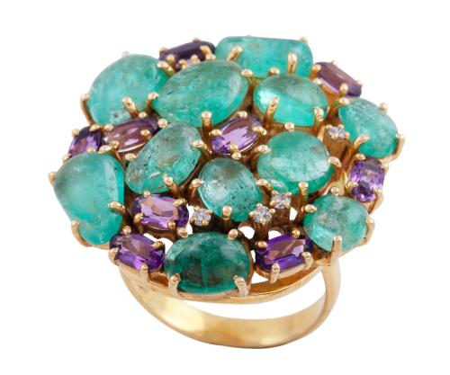 <span class='ref_item'>147 -</span> <span class="object_title">SORTIJA EN PLATA DE LEY, ESMERALDAS, AMATISTAS Y BRILLANTES</span>  <p><span class="technical_description">Sortija realizada en plata de ley. Adornada por esmeraldas en cabujón y amatistas en talla oval con pequeños diamantes en talla brillante en medio<br/>Medida Sortija: 15<br/>Ref 16291</span><br>Peso: <span class="PESO_HCES1">10,80</span> <span class="PESOUMED_HCES1">gr.</span><br></p>