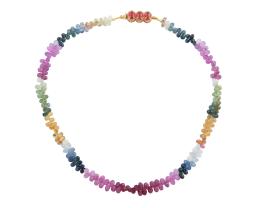 <span class='ref_item'>149 -</span> <span class="object_title">COLLAR CON ZAFIROS MULTICOLOR EN FORMA DE GOTA Y CIERRE EN PLATA CON ZAFIROS Y DIAMANTES</span>  <p><span class="technical_description">Collar realizado con zafiros multicolor en forma de gota. Cierre realizado en plata de ley chapada en oro con zafiros naranjas y diamantes. Cierre: broche con lengüeta.<br/>Longitud: 39.5 cm.<br/>Ref: 16597<br/> </span><br>Peso: <span class="PESO_HCES1">24,40</span> <span class="PESOUMED_HCES1">gr.</span><br></p>