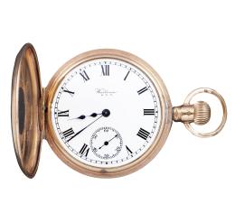 <span class='ref_item'>168 -</span> <span class="object_title">RELOJ DE BOLSILLO DE CAZADOR WALTHAM, CHAPADO EN ORO. SISTEMA REMONTOIR.</span>  <p><span class="technical_description">Caja chapada en oro. Sistema remontoir. Tapa posterior y guardapolvo numerados 156176. Maquinaria firmada A.W.W.Cº WALTHAM U.S.A. TRAVELER y numerada 26522258. Esfera de porcelana blanca con numeración romana, segundero a las seis, agujas en acero pavonado. Tapa guardapolvos y tapa exterior con numeración romana en esmalte negro. Diámetro: 40mm. En estado de marcha.</span><br>Peso: <span class="PESO_HCES1">107,50</span> <span class="PESOUMED_HCES1">gr.</span><br></p>
