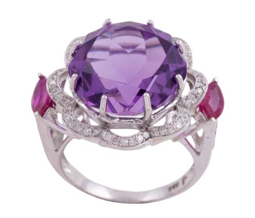 <span class='ref_item'>148 -</span> <span class="object_title">SORTIJA EN ORO 14KT, AMATISTA, RUBÍES Y BRILLANTES</span>  <p><span class="technical_description">Sortija realizada en oro de 14kt. Amatista central en talla redonda con peso aprox 11ct, en orla diamantes en talla brillante y en hombros rubíes en talla marquise y galería<br/>Medida Sortija: 14<br/>Ref 14530</span><br>Peso: <span class="PESO_HCES1">8</span> <span class="PESOUMED_HCES1">gr.</span><br></p>