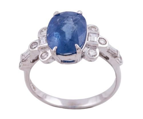 <span class='ref_item'>156 -</span> <span class="object_title">SORTIJA EN ORO 18KT, ZAFIRO Y DIAMANTES</span>  <p><span class="technical_description">Sortija realizada en oro de 18kt. Zafiro central en talla oval con peso aprox 3.66ct y en hombros diamantes en talla brillante y baguette con peso total aprox 0.42ct<br/>Medida Sortija: 13<br/>Ref 16174</span><br>Peso: <span class="PESO_HCES1">4,50</span> <span class="PESOUMED_HCES1">gr.</span><br></p>