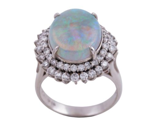 <span class='ref_item'>154 -</span> <span class="object_title">SORTIJA EN PLATINO CON ÓPALO Y DIAMANTES</span>  <p><span class="technical_description">Sortija realizada en platino. Con un ópalo con juego de color en talla cabujón y un peso total aprox (3.99CT) y orla doble de diamantes en talla brillante con un peso total aprox(1.04CT).<br/>Medida sortija: 14<br/>Ref: 16592<br/> </span><br>Peso: <span class="PESO_HCES1">11,70</span> <span class="PESOUMED_HCES1">gr.</span><br></p>