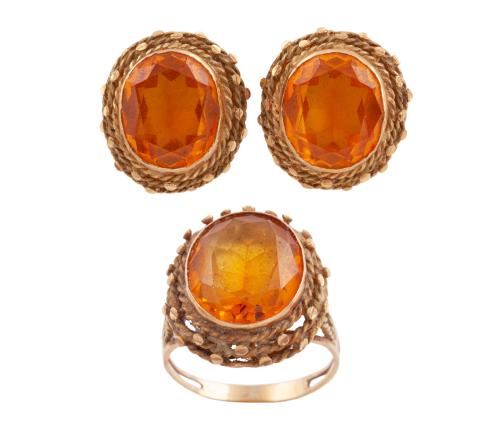 <span class='ref_item'>159 -</span> <span class="object_title">PENDIENTES Y SORTIJA EN ORO MACIZO DE 18KT CON ZAFIROS DORADOS SINTETICOS</span>  <p><span class="technical_description">Lote formado por pendientes y sortija realizados en oro macizo de 18kt con diseño calado y tallas ovales de zafiros dorados sintéticos.<br/>Medida sortija: 12<br/>Cierre pendientes: omega</span><br>Peso: <span class="PESO_HCES1">15</span> <span class="PESOUMED_HCES1">gr.</span><br></p>