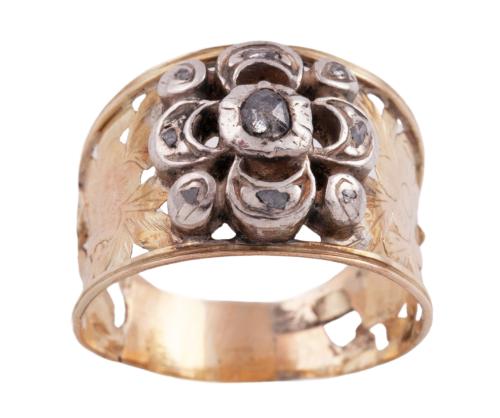 <span class='ref_item'>161 -</span> <span class="object_title">SORTIJA VINTAGE EN ORO MACIZO DE 18KT CON VISTAS EN PLATA MACIZA DE LEY Y DIAMANTES</span>  <p><span class="technical_description">Sortija realizada en oro macizo de 18kt con vistas en plata maciza de ley. Tiene un diseño calado y en la parte central diamantes en talla rosa.<br/>Medida sortija: 12</span><br>Peso: <span class="PESO_HCES1">3,70</span> <span class="PESOUMED_HCES1">gr.</span><br></p>