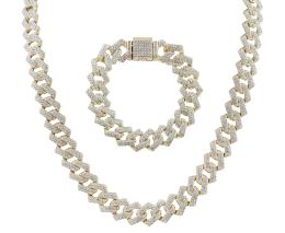<span class='ref_item'>181 -</span> <span class="object_title">CONJUNTO DE COLLAR Y PULSERA EN METAL CHAPADO EN ORO Y CIRCONITAS</span>  <p><span class="technical_description">Conjunto de collar y pulsera realizados en metal chapado en oro con eslabones cubanos cuajados de circonitas, también los broches.<br/>Cierre: Caja con reasa y mecanismo de seguridad<br/>Longitud: 60cm el collar, 18cm la pulsera</span><br>Peso: <span class="PESO_HCES1">120,40</span> <span class="PESOUMED_HCES1">gr.</span><br></p>