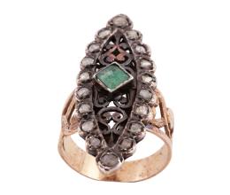 <span class='ref_item'>183 -</span> <span class="object_title">SORTIJA VINTAGE EN ORO MACIZO DE 18KT Y PLATA MACIZA DE LEY, ESMERALDAS Y DIAMANTES</span>  <p><span class="technical_description">Sortija realizada en oro macizo de 18kt con frontal en plata maciza de ley en forma de lanzadera. Con una esmeralda central y diamantes en talla rosa con un peso total aprox (0.19ct)<br/>Medida sortija: 15</span><br>Peso: <span class="PESO_HCES1">9,30</span> <span class="PESOUMED_HCES1">gr.</span><br></p>