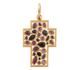 <span class='ref_item'>178 -</span> <span class="object_title">COLGANTE EN FORMA DE CRUZ EN ORO MACIZO DE 18KT, RUBÍES Y ZAFIROS</span>  <p><span class="technical_description">Colgante en forma de cruz realizado en oro macizo de 18kt. Diseño calado con tallas de rubíes y zafiros. <br/>Longitud: 5cm x 2.5cm</span><br>Peso: <span class="PESO_HCES1">2,40</span> <span class="PESOUMED_HCES1">gr.</span><br></p>