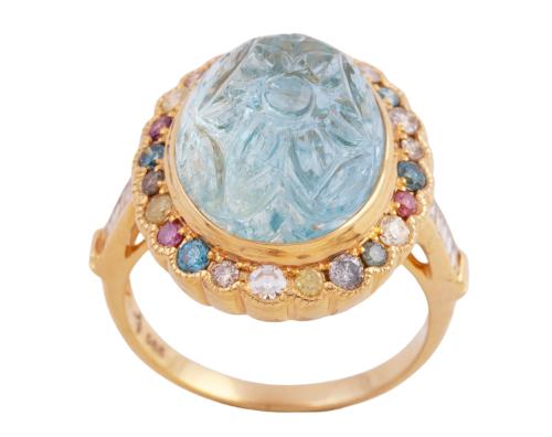 <span class='ref_item'>177 -</span> <span class="object_title">SORTIJA EN ORO 14KT, AGUAMARINA Y DIAMANTES MULTICOLOR</span>  <p><span class="technical_description">Sortija realizada en oro de 14kt. Aguamarina central en cabujón oval tallado con diseño de flor y peso aprox 21ct. En orla diamantes fancy multicolor en talla brillante y en hombro diamantes blancos en talla baguette, todos ellos con peso total aprox 1.29ct<br/>Medida Sortija: 14<br/>Ref 14525</span><br>Peso: <span class="PESO_HCES1">6,20</span> <span class="PESOUMED_HCES1">gr.</span><br></p>