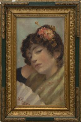 <span class='ref_item'>23 -</span> <span class="object_title">"RETRATO DE SEVILLANA 1989"</span>   <p><span class="author">JOSÉ ARPA Y PEREA (Carmona, 1858-Sevilla,1952)</span> <br><span class="technique_material">Óleo sobre lienzo</span><br><span class="technical_description">Representa a una mujer sevillana con una rosa en la cabeza.<br/>Firmado y fechado en el ángulo inferior derecho<br/>Enmarcado con cristal y marco de madera dorado. Algunos desperfectos en el marco.<br/>Medidas: 41,5 x 32 cm el lienzo. 54,4 x 45,5cm con marco.</span><br></p>