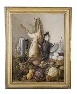 <span class='ref_item'>35 -</span> <span class="description">BODEGÓN DE CAZA CON LIEBRE Y HORTALIZAS </span>  <p><span class="description">ESCUELA ESPAÑOLA S.XIX <br>Óleo sobre lienzo<br>Bodegón con liebre, ave, frutas, verduras, huevos, una frasca de vino y una jarra con un vaso.<br>Enmarcado. Ligeros deterioros en el marco.<br>Medidas: 75 x 60cm con marco. 63,5 x 49cm sin marco</span></p>
