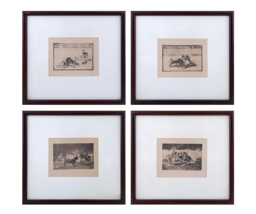 <span class='ref_item'>24 -</span> <span class="object_title">"LA TAUROMAQUIA" CÍRCULO DE BELLAS ARTES, MADRID (1929)</span>   <p><span class="author">FRANCISCO DE GOYA Y LUCIENTES (Fuendetodos, 1746-Burdeos, 1828)</span> <br><span class="technique_material">Aguafuerte</span><br><span class="technical_description">Conjunto de 4 grabados en aguafuerte que reproducen la serie "La Tauromaquia" realizada por Goya en 1816. Cada uno contiene el sello en seco con la efigie de Goya e inscripción "La Tauromaquia" en el ángulo inferior derecho, además de la enumeración del 25 al 28 en ángulo superior derecho.<br/>Edición realizada a partir de las planchas originales por la Calcográfica Nacional con motivo del centenario de la muerte del pintor y publicada por el Círculo de Bellas Artes en 1929.<br/>Enmarcados en madera y cristal con paspartú.<br/>Medidas huella: 12x16cm<br/>Medidas marco: 30x33,5cm</span><br></p>