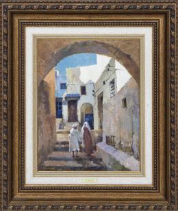 <span class='ref_item'>81 -</span> <span class="object_title">"TETUÁN"</span>   <p><span class="author">ESCUELA CONTEMPORÁNEA  </span> <br><span class="technique_material">Óleo sobre lienzo</span><br><span class="technical_description">Se muestra a tres personas reunidas bajo un arco de piedra en una calle de Tetuán.<br/>Firmado "TURINO" por el autor en el ángulo inferior izquierdo.<br/>Enmarcado en un bonito marco en madera tallada y trabajada con paspartú. Placa metálica de autor en el marco.<br/>Medidas con marco: 63cm x 55cm</span><br></p>
