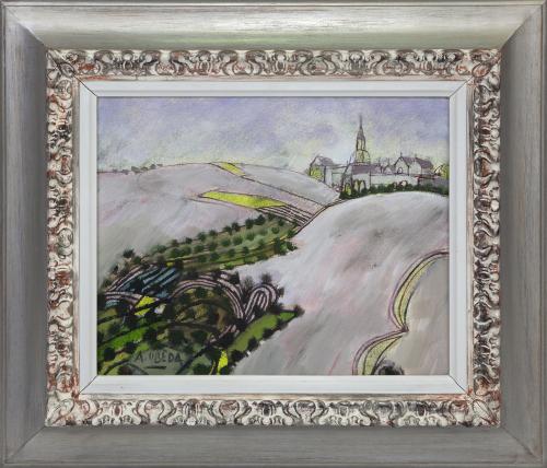 <span class='ref_item'>71 -</span> <span class="object_title">"LOMAS BUSCANDO NIEVE"</span>   <p><span class="author">AGUSTÍN ÚBEDA  (Herencia, Ciudad Real, 1925 - Madrid, 2007)  </span> <br><span class="technique_material">Óleo sobre lienzo</span><br><span class="technical_description">Representa uno de los motivos mas famosos de este pintor. Se aprecia un paisaje con una ciudad al fondo entre dos colinas. Firmado A. Úbeda por el autor y también firmado en la trasera. Enmarcado en marco de madera color plata. Medidas con marco: 63cm x 70.5cm</span><br></p>