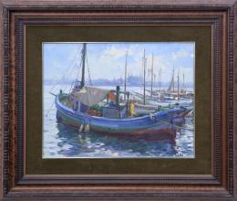 <span class='ref_item'>92 -</span> <span class="object_title">PUERTO DE MALLORCA, 1983</span>   <p><span class="technique_material">Óleo sobre tabla</span><br><span class="technical_description">Escena marítima en la que son representadas cuatro embarcaciones amarradas en el puerto. <br/>Firmado y fechado en el ángulo inferior derecho "SALAS, 83"<br/>Inscripción en el reverso: "Palma 83".<br/>Con marco de madera teñida y paspartú de color verde. Medidas sin marco 46 x 60cm y 78 x 93cm con marco.</span><br></p>