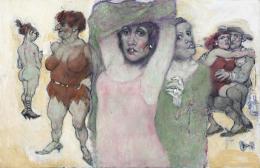 <span class='ref_item'>94 -</span> <span class="description">SIN TÌTULO </span>  <p><span class="description">ZOHRE MIRABASSI (Teherán, 1957) <br>Técnica mixta sobre táblex<br>Escena surrealista y caricaturizada de un lupanar representando a varias mujeres, una de ellas acompañadas de un torero. <br>Sin marco <br>66 cm.x100 cm.</span></p>